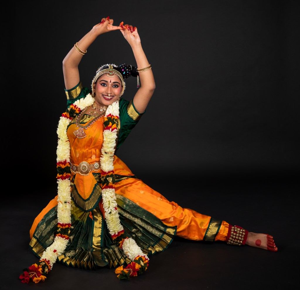 Thillana is marked by its features, which are crisp and exhilarating pure dance or nritta followed by sahityam. It is typically performed at the end of a Bharatanatyam performance. The thillana is characterized by fast-paced footwork, intricate rhythms, and a repeating melody. It is often set to a Carnatic music composition that features intricate percussion accompaniment. The Bhoopalam Thillana in Bharatanatyam is performed with crisp, energetic movements, showcasing the dancer’s technical agility and command over rhythm. It begins with a series of vibrant jatis, where the dancer executes precise footwork, angular arm movements, and dynamic poses that emphasize symmetry and strength. The poses often include araimandi (half-sitting stance), alapadma (lotus-shaped hands), and dramatic body extensions that highlight grace and geometry. The rhythmic sections are marked by leaps, spins, and sharp transitions, creating a visually arresting experience. In the sahityam section, the dancer may briefly switch to abhinaya (expressive storytelling), using gentle facial expressions and flowing gestures to depict a deity or poetic sentiment, usually one of serenity or devotion, in keeping with the calm mood of Raga Bhoopalam. The choreography balances rigor and refinement, moving seamlessly between stillness and fluidity. Overall, the Bhoopalam Thillana is a radiant, celebratory finale, leaving a lasting impression through its lilting rhythm, stylized poses, and lyrical elegance.